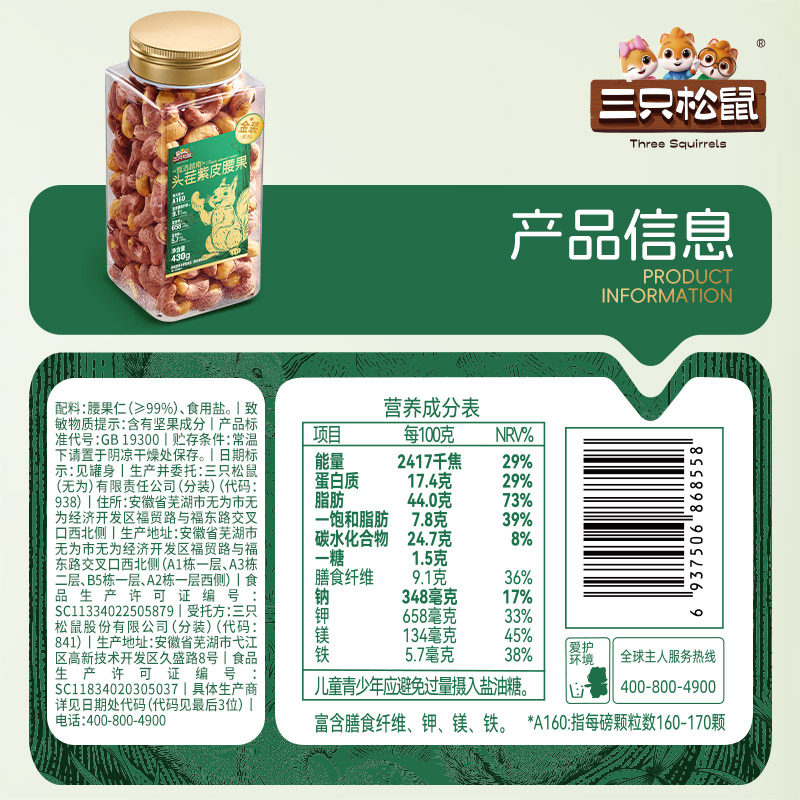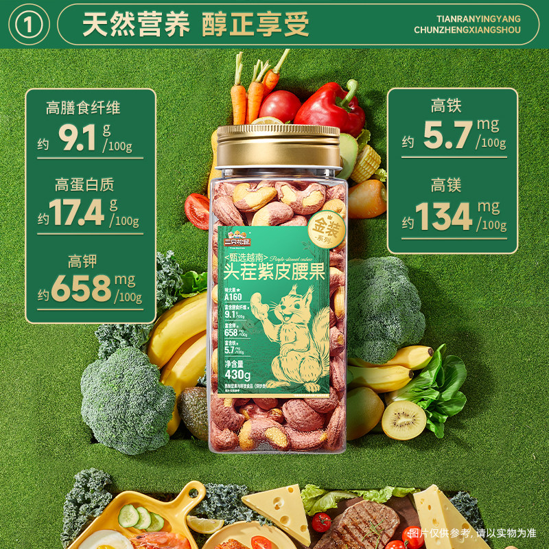 三只松鼠金装越南紫皮腰果430g罐装坚果腰果仁大颗粒休闲健康零食