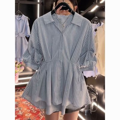 韩系潮流时尚烫钻条纹衬衫女2026夏季新款超仙名媛休闲百搭衬衣潮