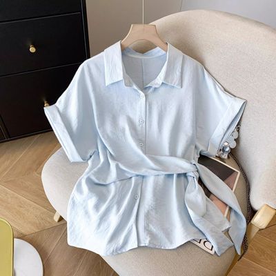 广州十三行爆款女装洋气质翻领衬衫蓝色上衣夏季韩版收腰短袖衬衣