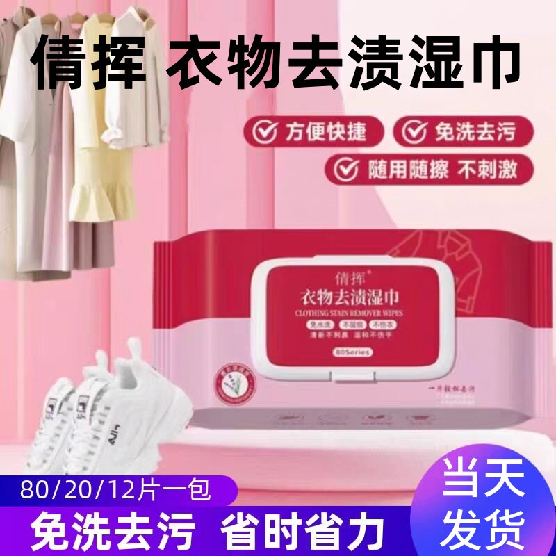 倩挥衣物去渍湿巾去油渍除污渍大包80抽应急去污免水洗免洗手洗辉